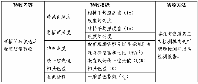 1.中标供应商需在每所拟改造的学校内选取其中1间普通教室进行样板间施工改造,改造后由有资质的第三方检测机构按表2的验收指标进行样板间教室照明质量检测,检测合格后方能对其他教室进行改造。全部改造完成后按验收抽样原则抽取教室再次进行教室照明质量检测。